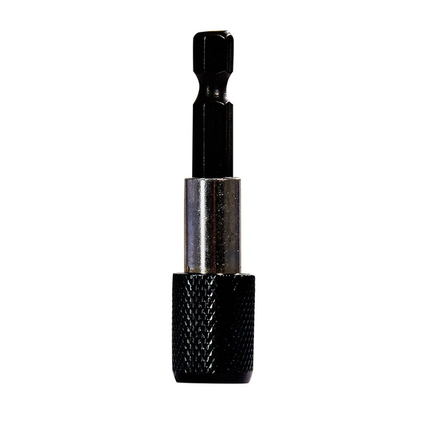 Тримач для біт виготовлений з нержавійної сталі, хвостовик із Cr-V сталі. У тримачі встановлено потужний магніт, який надійно фіксує навіть довгі біти та полегшує вкручування гвинтів. Крім магніту реалізований фіксатор, який унеможливлює випадіння біт при роботі. Насадки легко встановлюються в тримач одним натисканням, а відтягнувши назад втулку, їх легко звільнити. Такий пристрій дозволяє швидко змінювати біти та надійно їх утримувати.