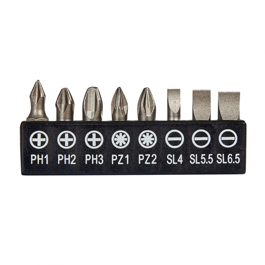 Є кольорове маркування біт для їх швидкого вибору. Насадки виготовлені з високоміцної сталі S2, яка відрізняється довговічністю та не схильна до руйнування. У складі цієї сталі є молібден і кремній, які надають виробу високий опір до навантажень та низький поріг оборотної деформації. Твердість сталі — 58-62 HRC.