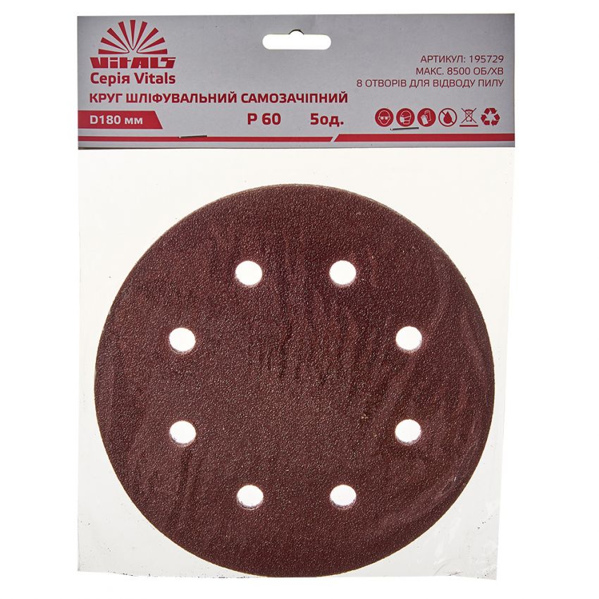 Круг шліфувальний самозачіпний Vitals 180 мм 8 отв з. 60, 5 шт.