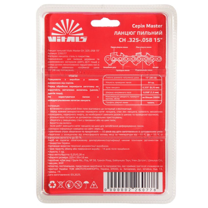 Пильний ланцюг Vitals Master СH.325-.058 15" — надійний ріжучий елемент, що відіграє ключову роль у роботі ланцюгової пили. Саме від нього залежать ефективність, точність та безпека під час розпилювання деревини.